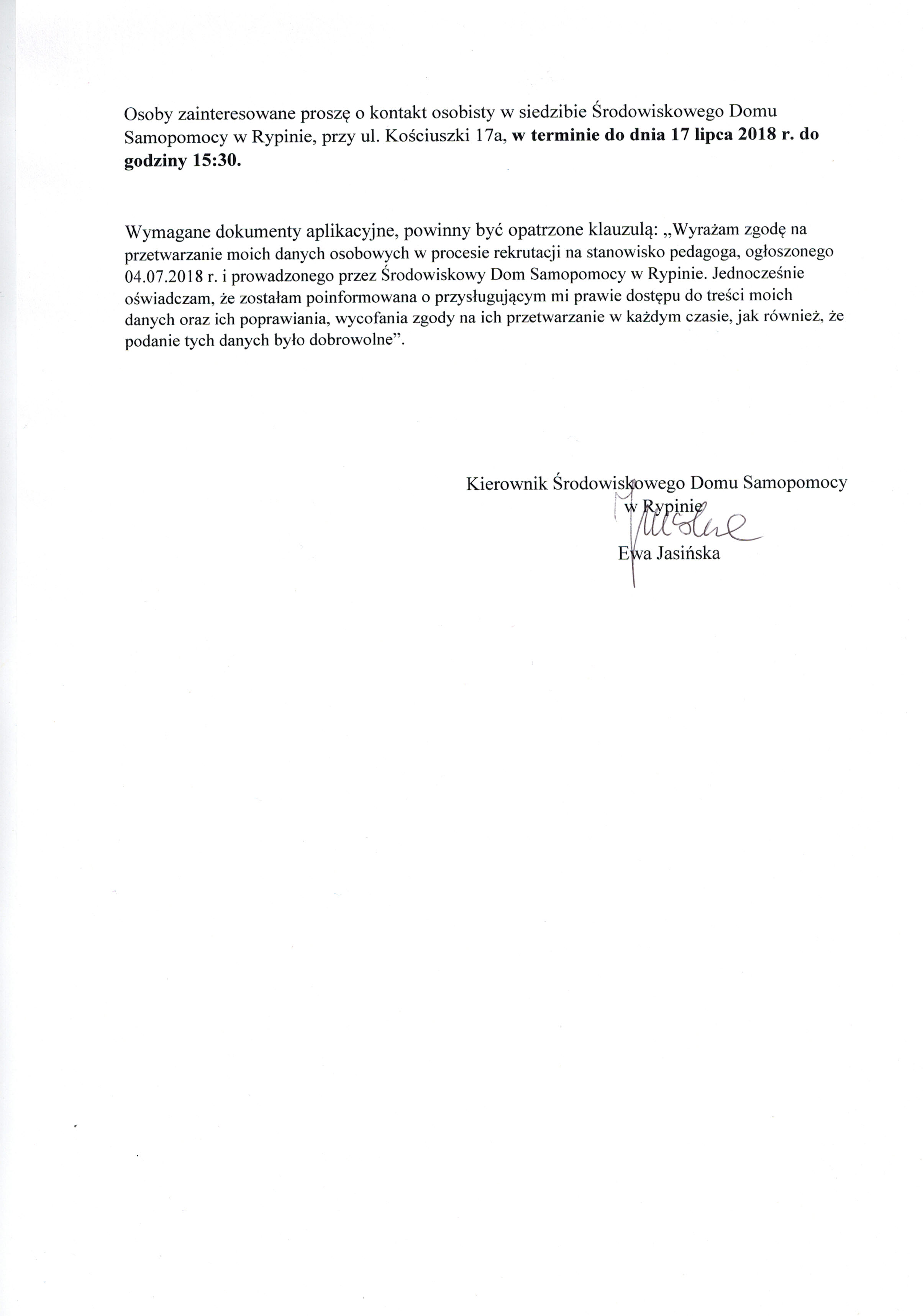 | edytowane: | data: 08:57, 05.07.2018 | przez: Magdalena Liszewska | Kierownik Środowiskowego Domu Samopomocy w Rypinie zatrudni pedagoga | |